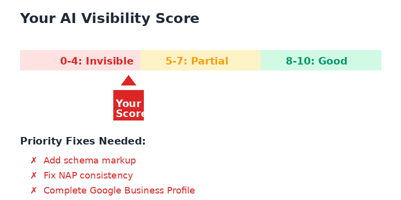 - 0-4 points: Invisible or unreliable to AI. Priority fixes needed urgently.